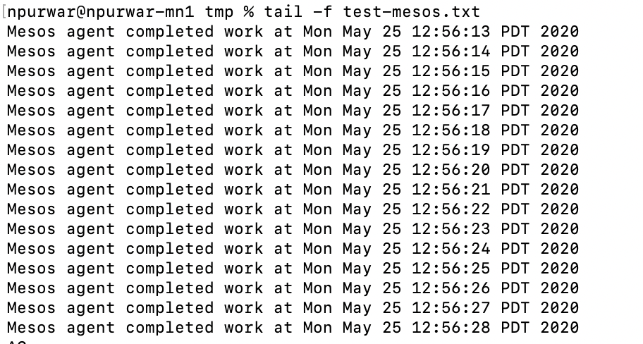 $ sudo /usr/local/sbin/mesos-agent --master=127.0.0.1:5050 --work_dir=/Users/npurwar/tmp/mesos-slaves